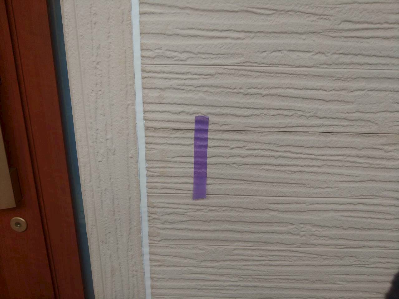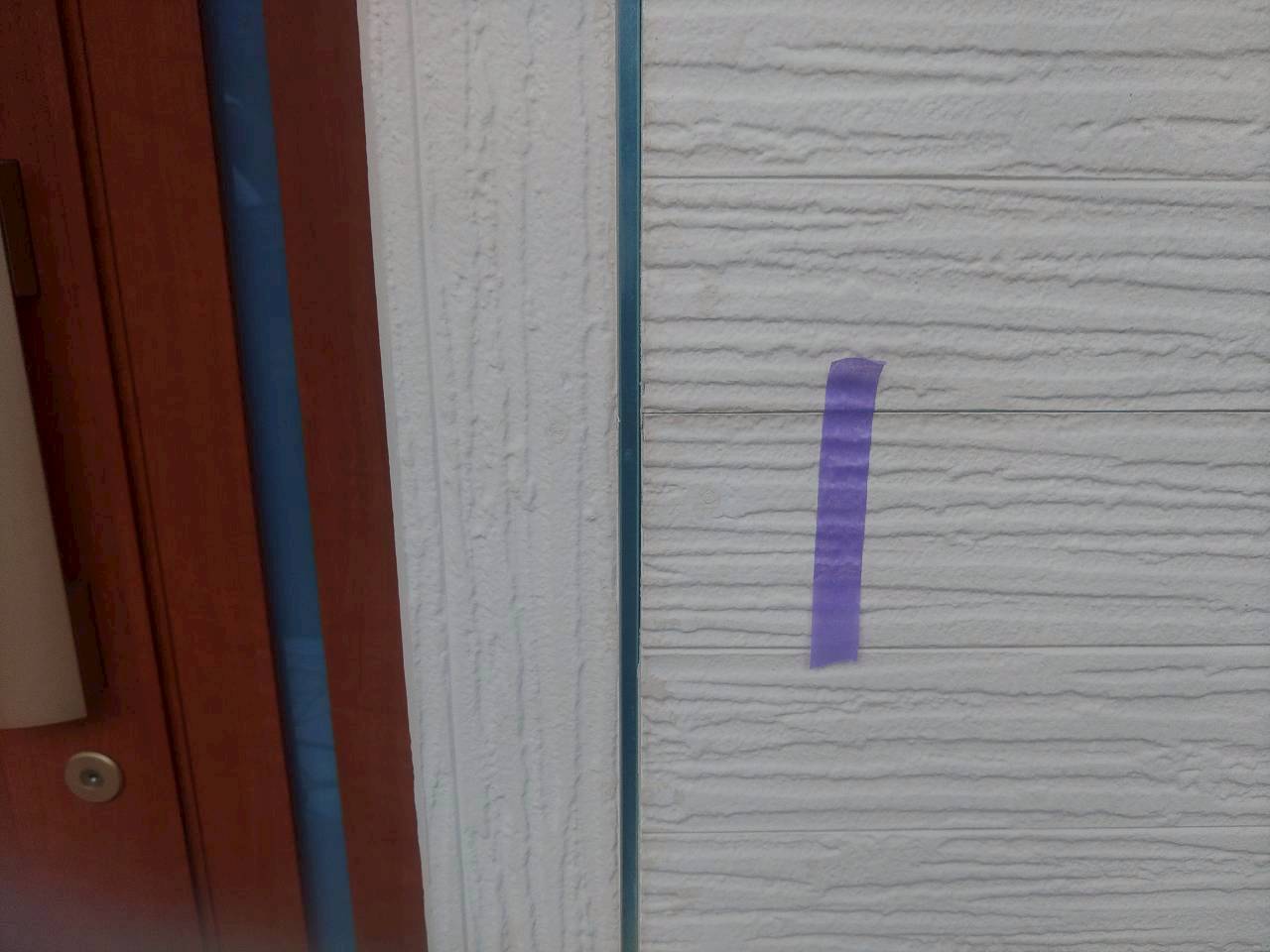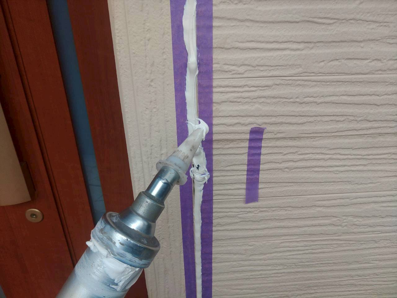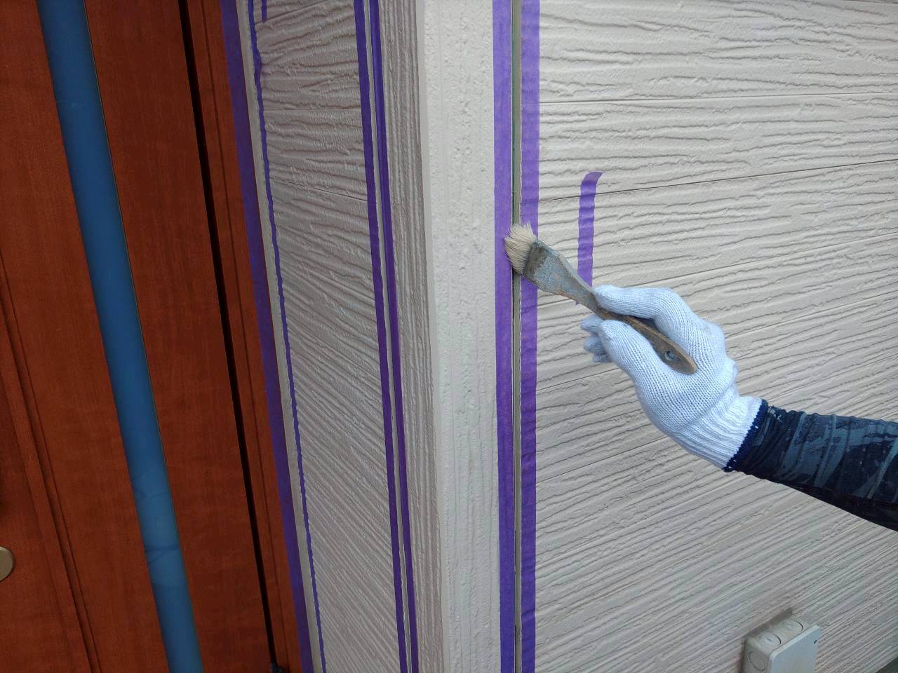 今回の現場でも、画像のように外壁の目地部分を紫色の養生テープでしっかりと覆い、周囲にシーリング材がはみ出さないよう準備を整えました。