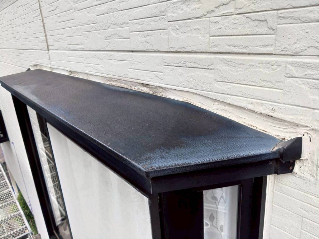 施工後の写真をご覧いただくと、庇上端の目地部分に均一で美しいシーリングラインが形成されているのがわかります。 既存の剥離・隙間は完全に解消され、雨水の浸入経路が確実にふさがれた状態です。 養生ラインに沿ったシャープな仕上がりは、職人の丁寧な作業の証です。