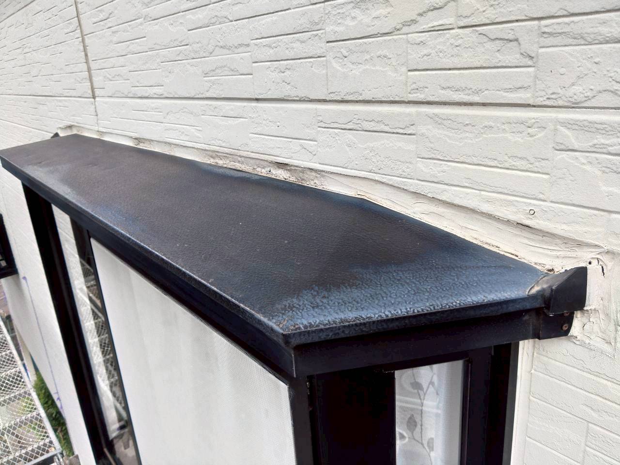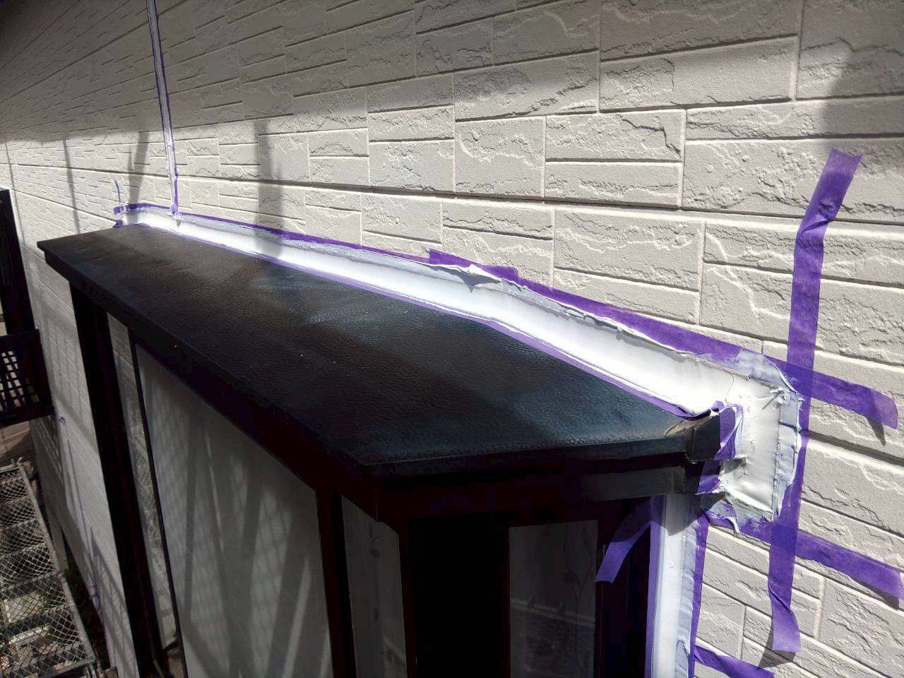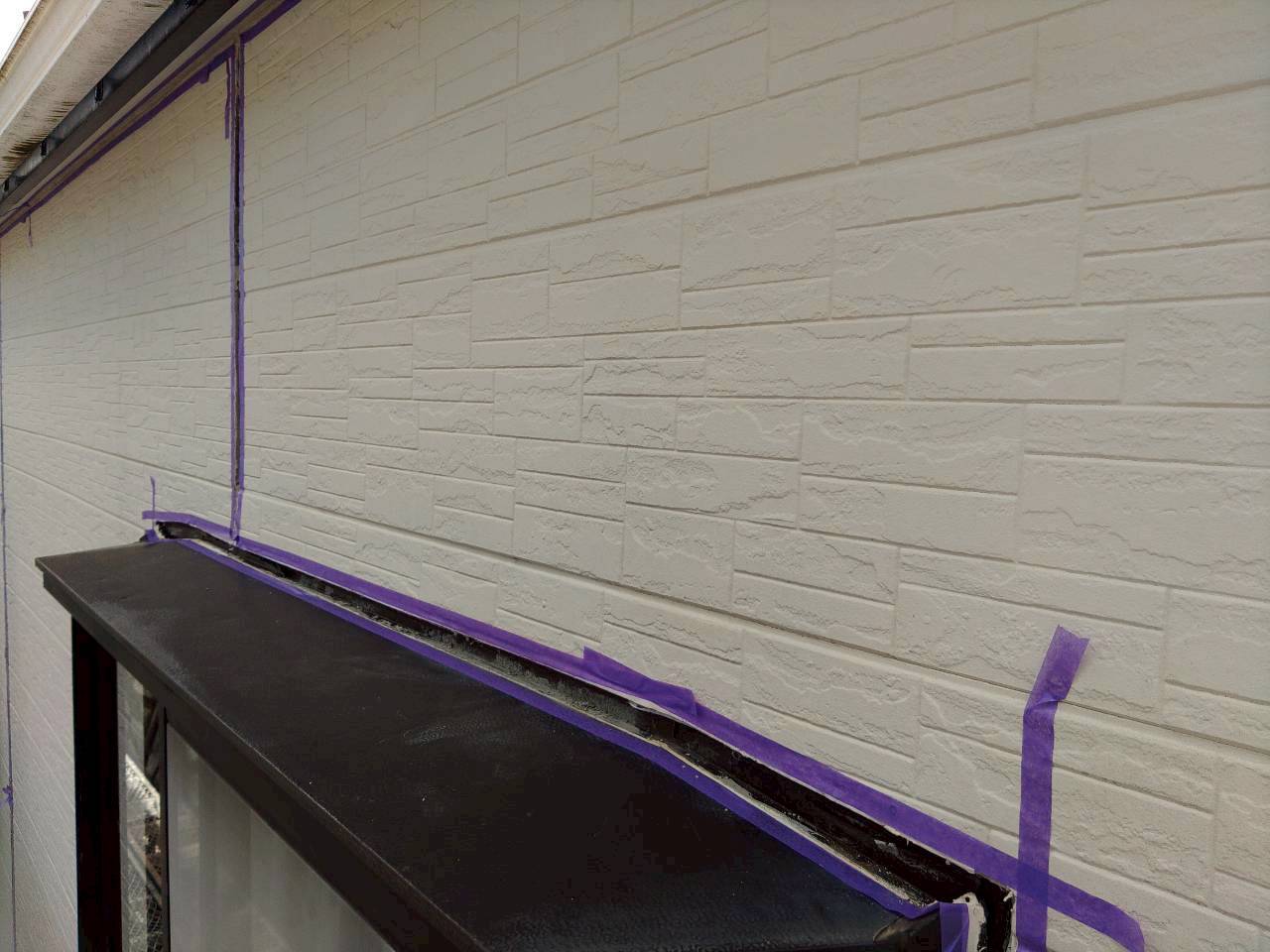 養生完了後、シーリング材の密着性を高めるためにプライマー(下塗り材)を丁寧に塗布しました。 プライマーはシーリング材と下地の接着を強固にする役割を担っており、この工程を省略すると後々の剥離トラブルにつながります。 特に金属製の庇まわりや、サイディング目地では密着不良が起きやすいため、プライマーの塗布は欠かさず実施しています。