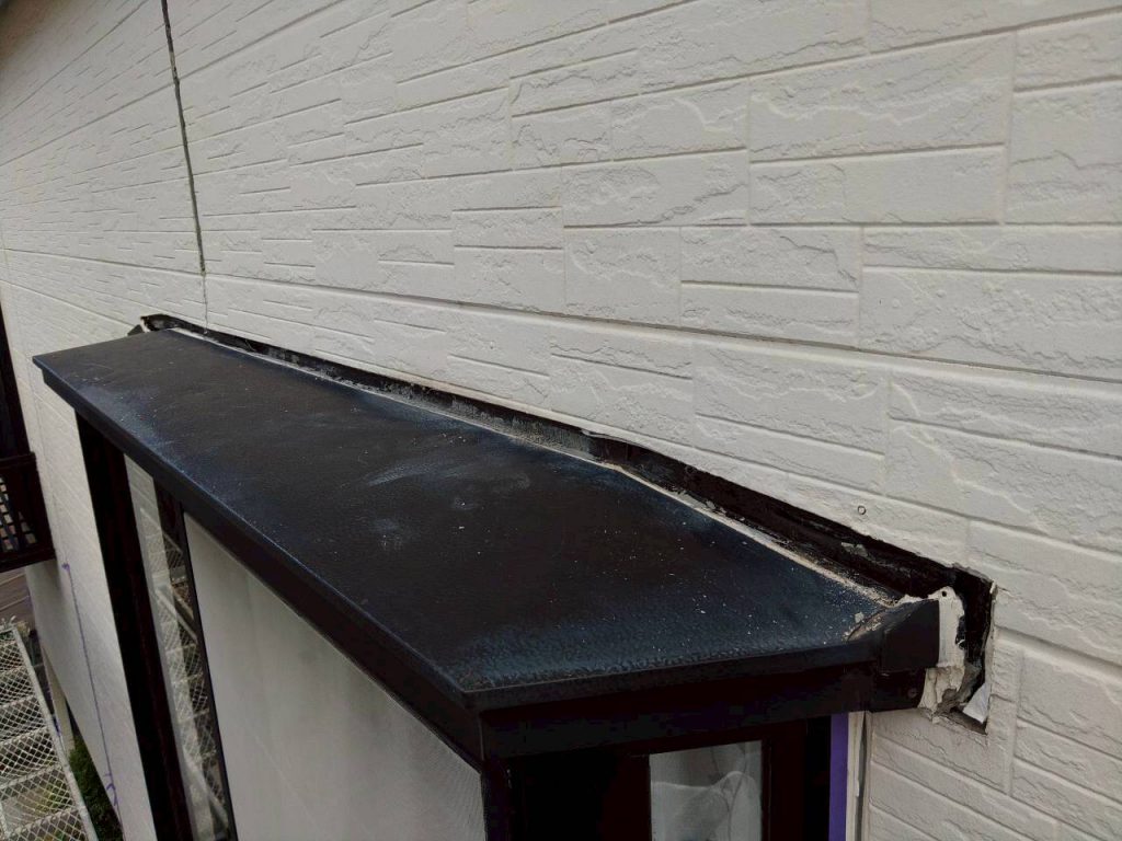 まず、劣化した既存のシーリング材をカッターで丁寧にカットし、手作業で完全に除去しました。 古いシールが残っていると新しいシーリング材との密着不良が起きるため、撤去の精度が仕上がりの品質を大きく左右します。 今回は庇まわりの入り組んだ箇所も含め、下地が見えるまで丁寧に撤去作業を行いました。